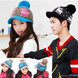 批發(fā) 秋冬韓版大絨球鴨舌帽針織毛線帽子 雪花 小鹿拼色鴨舌帽