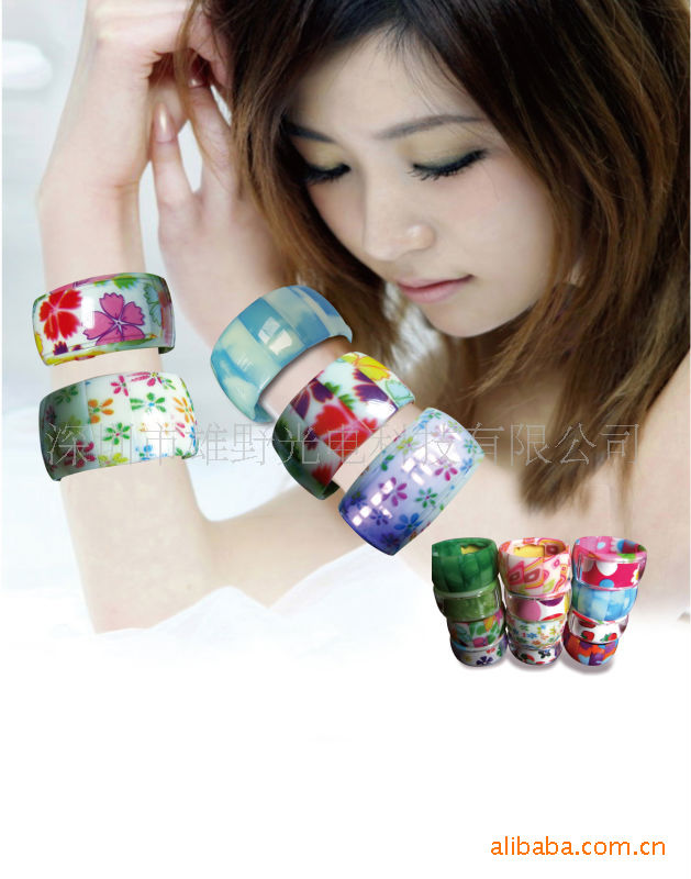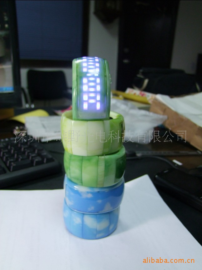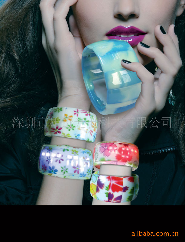 該花手鐲表是我司剛開發(fā)的新產品,并申請了技術專利,LED顯示功能,戴在手上不看時間就是一個花鐲子,看時間就按一下按鍵,時間、日期,都可以看到,該款產品花樣繁多,可以跟衣服相互搭配,穿什么樣顏色的衣服就配什么顏色的手鐲,是20歲左右的靚女夏天的裝飾品,又是手鐲表。