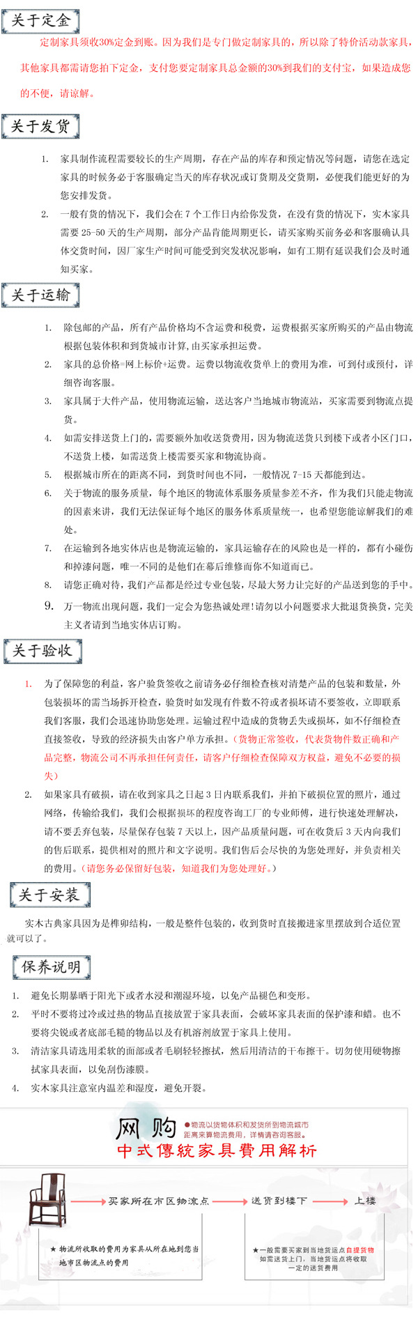 【寶貝說(shuō)明】:雕花圓柱雙人箱床,儲(chǔ)物功能豐富,瀧凱達(dá)家具為滿足客戶需求,縮短訂貨周期,精心制作一批精品現(xiàn)貨。買家所見(jiàn)圖片即收到商品(所見(jiàn)即所得)??臻g有限,沒(méi)辦法上傳原始大圖,歡迎預(yù)購(gòu)買家具的客戶來(lái)索取大圖。請(qǐng)買家不要用板式家具的平整度來(lái)跟原木家具進(jìn)行比較,兩種材質(zhì)兩種工藝所以也沒(méi)有可比性。