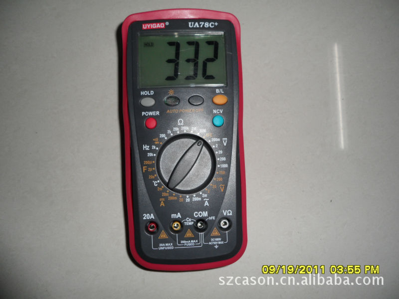 UA78C 是新一代31/2位大屏幕液晶顯示數(shù)字萬用表??捎糜跍y量交、直流電壓、交、直流電流、電阻、電容、溫度、晶體三極管放大倍數(shù)、二極管正向壓降及通斷蜂鳴。具有數(shù)據(jù)保持、自動關(guān)機、低電壓顯示等功能。