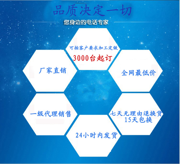 我司是專業(yè)研發(fā)、生產(chǎn)和銷售有繩電話機(jī)的直銷廠家,現(xiàn)為了惠及廣大的普通消費(fèi)者和擴(kuò)大我司的口碑,現(xiàn)對(duì)我司的幾款新品進(jìn)行底價(jià)大促銷,支持網(wǎng)購和定做。公司研發(fā)人員有20多年的研發(fā)經(jīng)驗(yàn),公司員工有300多人月產(chǎn)量25萬臺(tái),有噴油部,塑膠部、絲印部、開發(fā)部,我公司有8年的OEM生產(chǎn)定做經(jīng)驗(yàn),款式將近500多種定做各種類型的電話機(jī)。