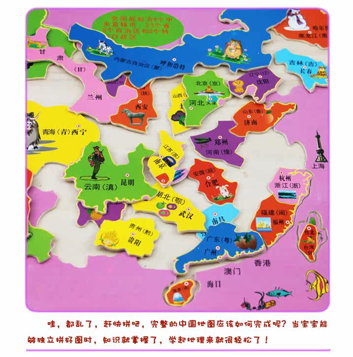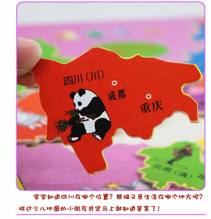 產(chǎn)品描述:色彩很豐富.培養(yǎng)孩子初級(jí)的地理知識(shí),風(fēng)土人情呀!鍛煉手眼協(xié)調(diào)和腦力,了解自己的祖國,國寶大熊貓生長在哪里?那里的人民喜歡吃辣椒(比如四川的版塊上有一個(gè)熊貓還有一個(gè)辣椒). 人的能力有看不見的部分和看的見的部分,比如對(duì)于植物來說,有看的見的美麗鮮花的部分,也有看不見的在地里靜靜的堅(jiān)強(qiáng)的延伸的根的部分。 教育的基本,必須從根基開始培育,為將來開出美麗鮮艷的鮮花做基礎(chǔ),這就是我們提倡的“親子智力玩具”。 所以我們建議:對(duì)于寶寶的教育,大人們千萬不要只照顧寶寶的吃、穿、睡,適時(shí)進(jìn)行全面和諧的早期教育,合理開發(fā)寶寶的身心潛能,是父母給予寶寶一生有價(jià)值的財(cái)富.................