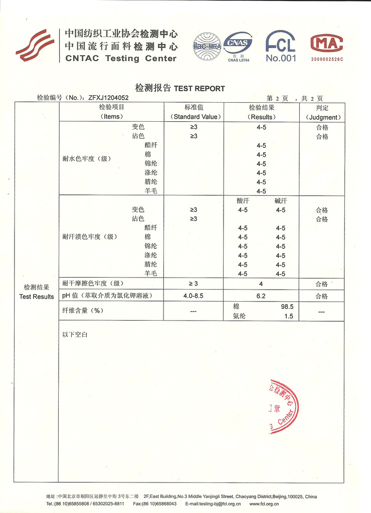 面料是彈力棉,以下是面料檢測報告