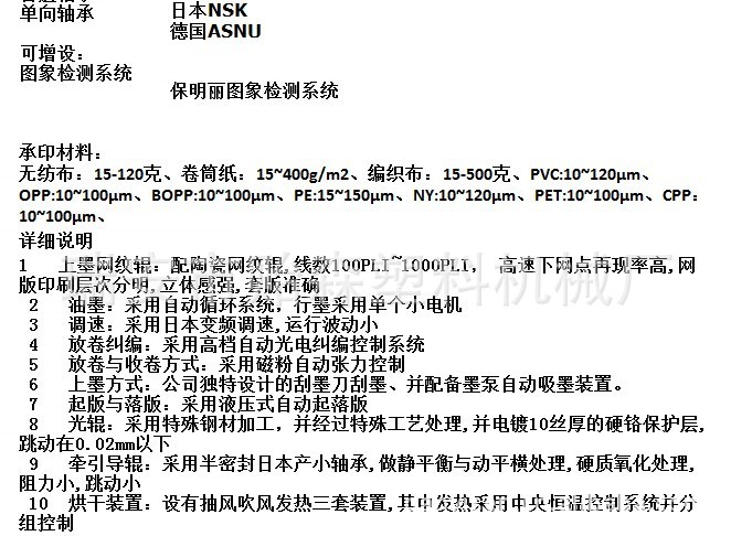 用途: 該機適合印刷聚乙烯、聚丙烯塑料袋、玻璃紙、卷筒紙,無紡布等包裝材料,是食品包裝,超市手提袋、馬夾袋、服裝袋,無紡布袋等包裝的理想印刷設(shè)備。 性能和特點: 1、操作簡便,起動柔和,套色準(zhǔn)確。 2、計米器可根據(jù)要求設(shè)定印刷數(shù)量,到數(shù)自動停機,斷料自動停機。 3、手動起落印版滾筒,升降后油墨自動攪拌。 4、網(wǎng)紋滾筒傳墨,墨色均勻。 5、可靠的干燥系統(tǒng),配合高速運轉(zhuǎn),停機自動斷路。 6、360度連續(xù)可調(diào)的縱向?qū)ㄑb置。 7、進口變頻電機調(diào)速,適應(yīng)不同印刷速度。 8、版輥座上及收料架上均裝有點動及停止按鈕,便于裝版時操縱機器