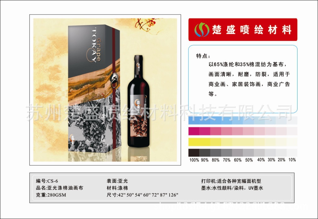 蘇州楚盛產(chǎn)品包括廣告類(旗幟布,熱升華旗幟布,戶外寫真布);高光溶劑類(高光防水棉畫布,高光防水油畫布,高光防水亞麻油畫布);亞光水性類(亞光滌棉油畫布,亞光亞麻油畫布,亞光化纖油畫布,亞光棉畫布);高光水性類(高光棉畫布,高光化纖油畫布,高光滌棉油畫布,高光亞麻油畫布);亞光弱溶劑類(亞光弱溶劑化纖油畫布,亞光弱溶劑棉畫布,亞光弱溶劑滌棉油畫布,亞光弱溶劑亞麻油畫布);手繪類(手繪油畫布,手繪亞麻布);新品類在(寫真布,水性高光防水油畫布,白畫布,投影布),六大系列,廣泛應(yīng)用于仿真油畫布、婚紗、影樓、舞臺(tái)背景、條幅、布幔、戶內(nèi)外海報(bào)、掛畫、燈箱廣告、媒體宣傳、易拉寶、裝飾窗簾、X展架、商場(chǎng)內(nèi)廣告宣傳等領(lǐng)域