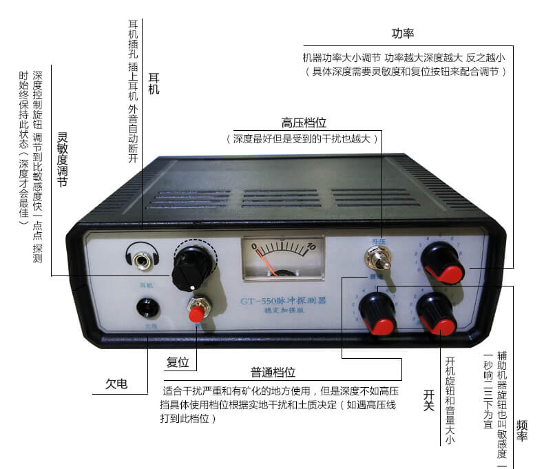 操作方法:開關:開機旋鈕和音量大小功率:機器功率大小調(diào)節(jié) 功率越大深度越大 反之越?。ň唧w深度需要靈敏度和復位按鈕來配合調(diào)節(jié))