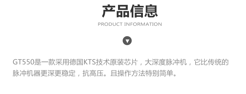 GT550是一款采用德國KTS技術原裝芯片,大深度脈沖機,它比傳統(tǒng)的脈沖機器更深更穩(wěn)定,抗高壓。且操作方法特別簡單。