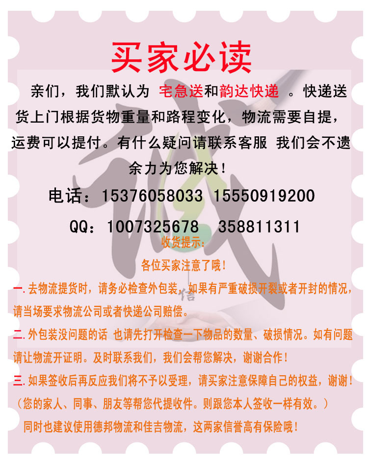 各位買家注意了!在去物流提貨時(shí),請(qǐng)先打開檢查一下物品的數(shù)量、破損情況。如有問題請(qǐng)讓物流開證明。及時(shí)聯(lián)系我們,我們會(huì)幫您解決,謝謝合作?。募胰?、同事、朋友等幫您代提收件。則跟您本人簽收一樣有效。物流提貨后就代表確認(rèn)貨物正確完好,數(shù)量正確,之后發(fā)生的問題我將不承擔(dān)責(zé)任。如不放心請(qǐng)自己簽收?。?/p>