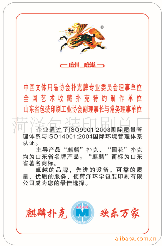 菏澤包裝印刷總廠、菏澤環(huán)宇包裝印刷有限公司主導(dǎo)產(chǎn)品“麒麟”系列***和廣告定制***采用優(yōu)質(zhì)的材料和***的工藝,其挺度、滑度、耐折度、清晰度及柔和、舒適的手感明顯與眾不同,各項(xiàng)指標(biāo)處于行業(yè)***水平。08年企業(yè)通過了ISO9001:2000質(zhì)量管理體系認(rèn)證,“麒麟”***為山東省產(chǎn)品?! ?/p>