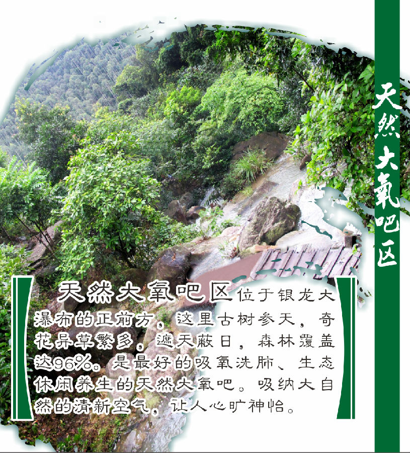 景區(qū)主要的景點(diǎn)有:省內(nèi)蔚為壯觀的銀龍大瀑布、集吃、喝、玩、樂于一體的神仙島公園;大森林***氧吧區(qū);奇石遍布、河水清澈的十里奇石河;穿越深山密林的休閑養(yǎng)生木棧道、古樸風(fēng)情水車群和***泳場(chǎng)等。