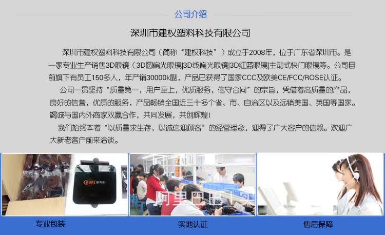 ★本公司鄭重承諾:在本公司購(gòu)買的任何一款3D眼鏡,經(jīng)過(guò)公司工程師格測(cè)試,鏡片透光性好,框架耐磨舒適,鏡框與鏡片都采用***標(biāo)準(zhǔn)的環(huán)保材料,不會(huì)對(duì)人的皮膚和眼睛產(chǎn)生任何傷害,請(qǐng)放心用!