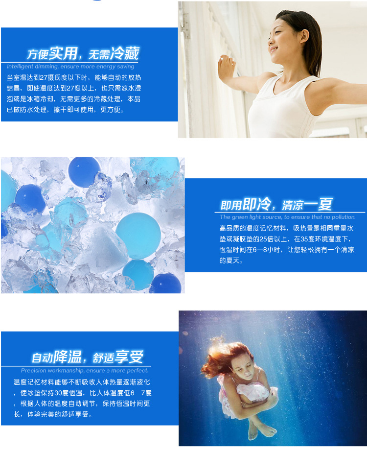 降溫原理:吸冷、除冷、散熱原理。主要采用隨溫度變化而發(fā)生神奇變化,根據(jù)人體適應溫度25-30攝氏度冰點。