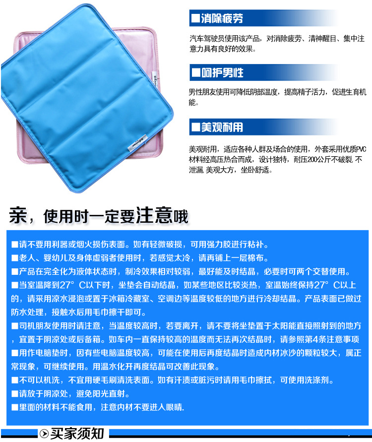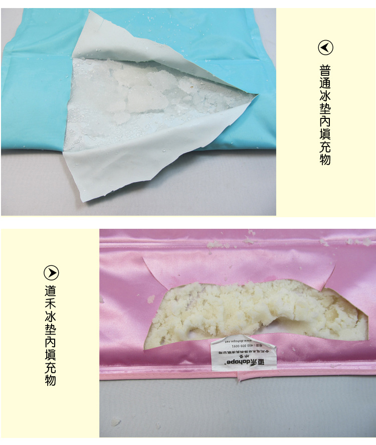 1.道禾dohope冰墊不怕壓,但請注意不要用尖銳鋒利物品劃刺產品表面,不要在太陽下長時間暴曬。使用一段時間后可能會有少量結晶塊,不影響使用,搖晃使其均勻即可恢復。