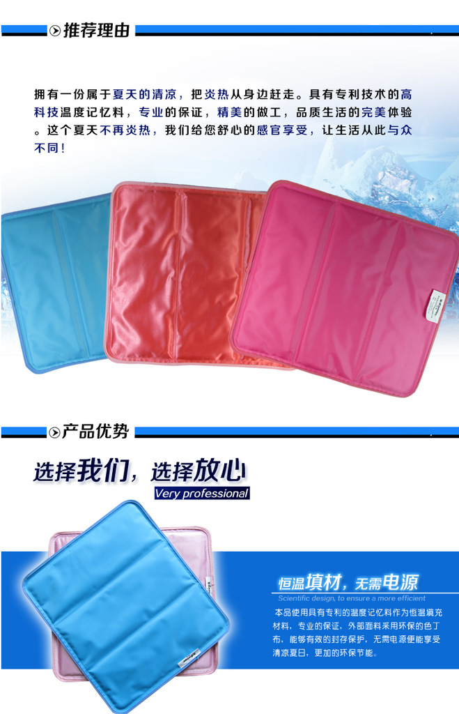 特點:不用電,經(jīng)濟、美觀耐用、環(huán)保,可恒溫7-9小時,可反復使用4年以上,長期保持涼爽。