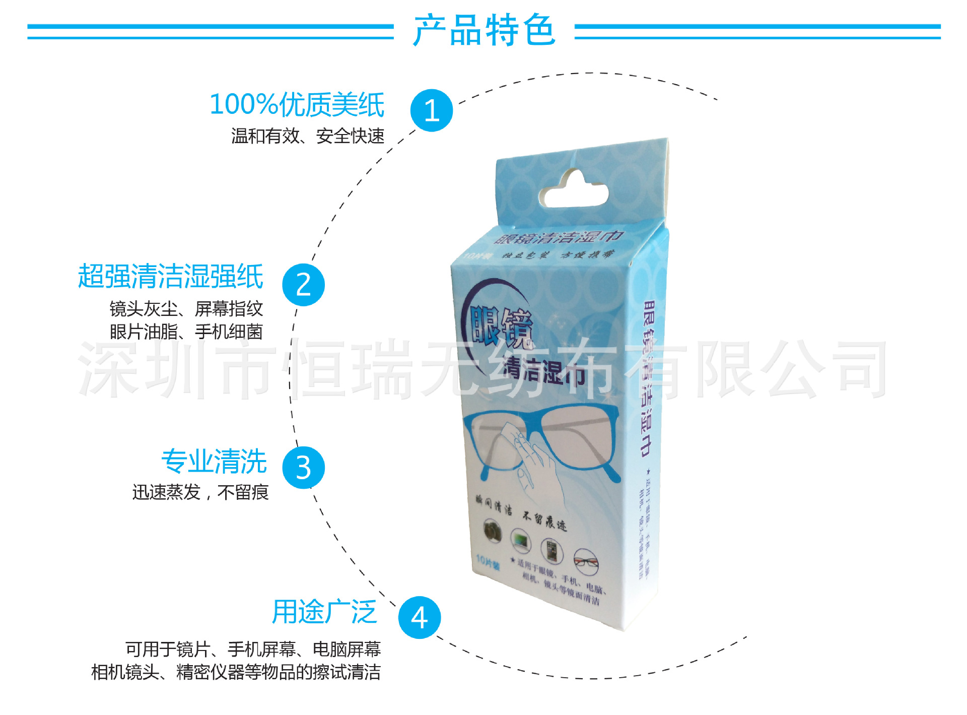 產(chǎn)品成分:采用進口濕強紙及納米活性劑,去離子水,表面活性劑等***配方精制而成含有***成分,使用后能使手機屏幕 鏡片清潔衛(wèi)生,殺滅常見致病菌群.