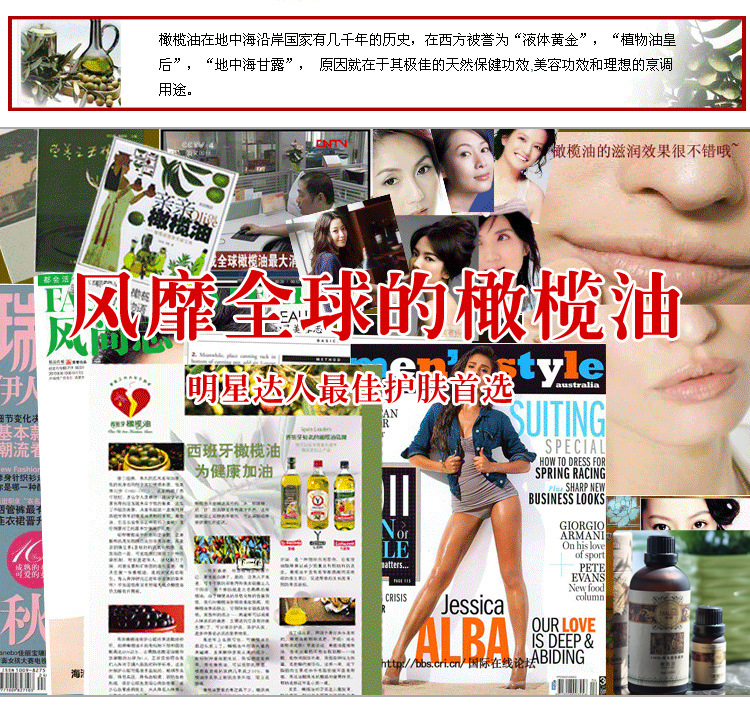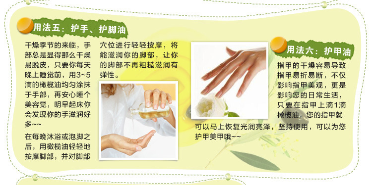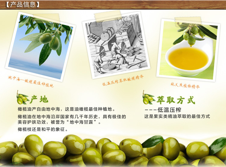 【產(chǎn)品功效】:橄欖油是從橄欖中榨取出來的一種蛋黃色透明液體,