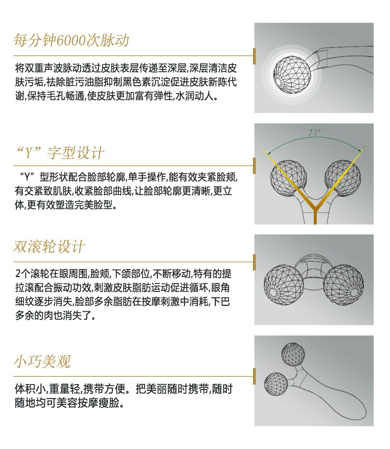 風(fēng)靡日本,***的Y型設(shè)計,適合全身按[mo],這就是easyface 3D***塑肌儀,宛如清風(fēng)拂面般滾動按[mo],微電流緊貼于肌膚,加速血液循環(huán),促進新陳代謝,讓肌膚恢復(fù)活力,充滿彈性!