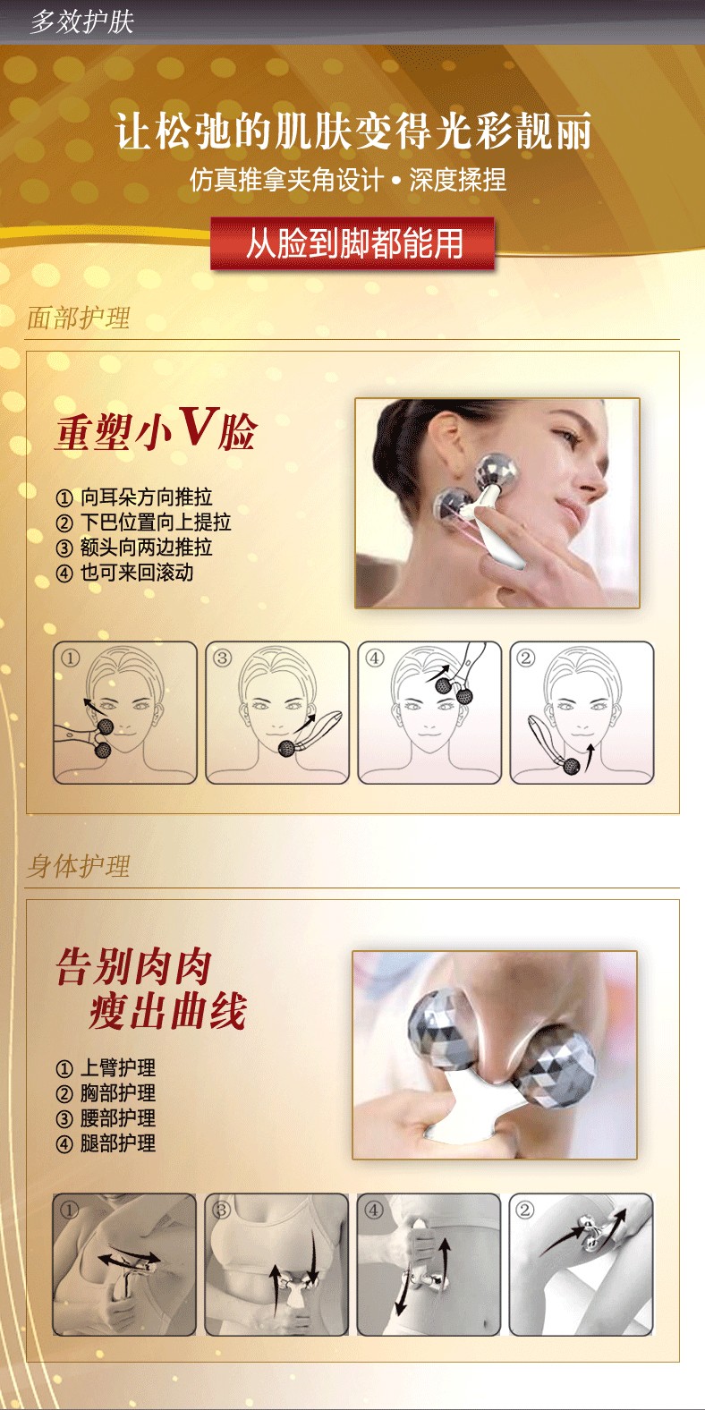 3D***塑肌儀滾輪的八角形設(shè)計,能讓滾輪更加貼合肌膚,能讓下頜變得纖細漂亮。只需轉(zhuǎn)動按[mo]器,整個身體都能感受到高度的貼合感和***的吸抽技術(shù);不止針對于臉,還可以用于身體的全新設(shè)計,其適當(dāng)?shù)拇笮∨cV字型設(shè)計適用于全身;優(yōu)良的合身感及左右滾動的技術(shù)讓你在家里也能感受到***版的全身美容!