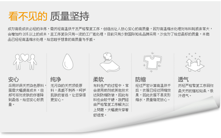 2.易縮水,純棉衣物的縮水率是2%到5%,經(jīng)過特殊加工,或洗水處理例外。