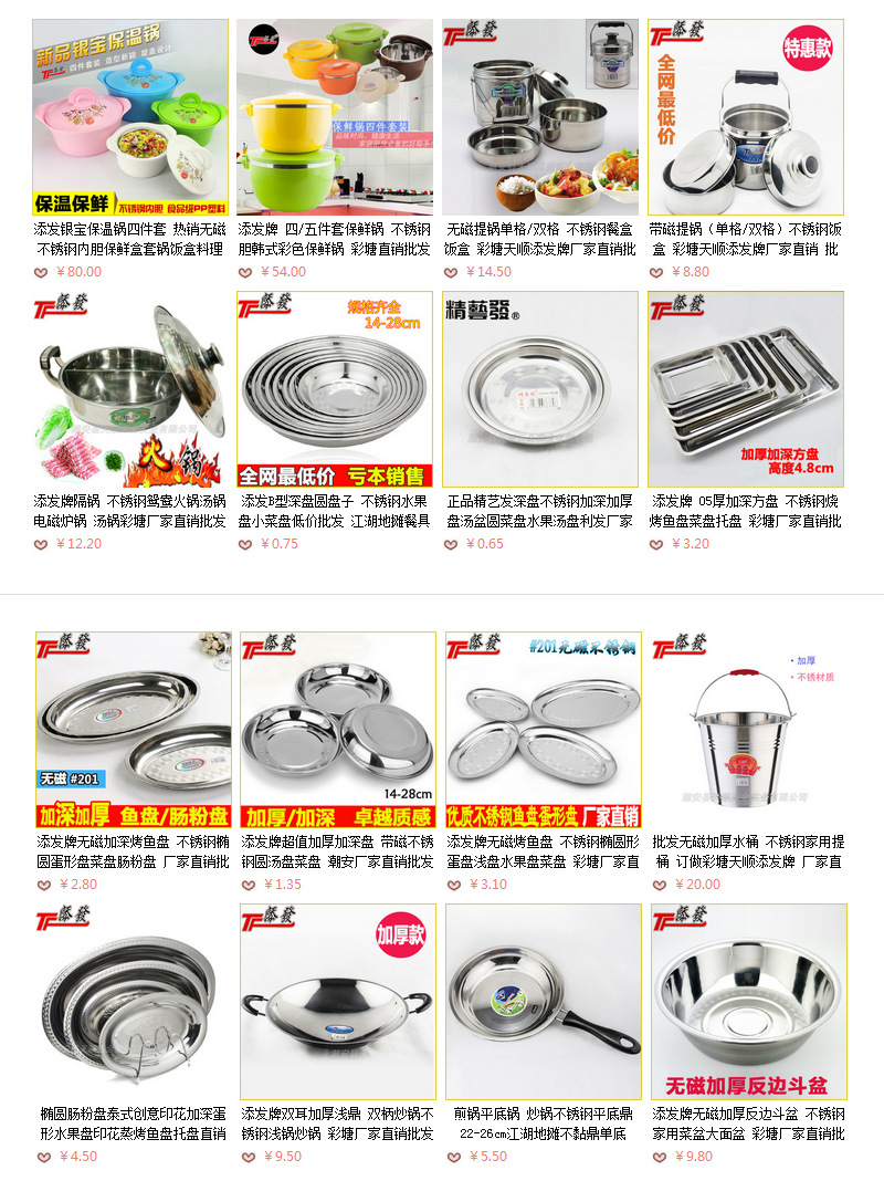 潮安縣天順五金實業(yè)有限公司是一家***生產(chǎn)電磁爐多用鍋、漲形油盆、提鍋、多層提鍋、加深圓盤、馬斗、巢斗、蛋形盤、加深蛋盤、面盆、湯盆、深盤、單/雙柄炒鼎、電磁爐炒鼎等系列產(chǎn)品,產(chǎn)品造型美觀,光亮度好,品種繁多。 旗下“添發(fā)”品牌熱銷海內(nèi)外市場,歡迎來函來電洽談合作!