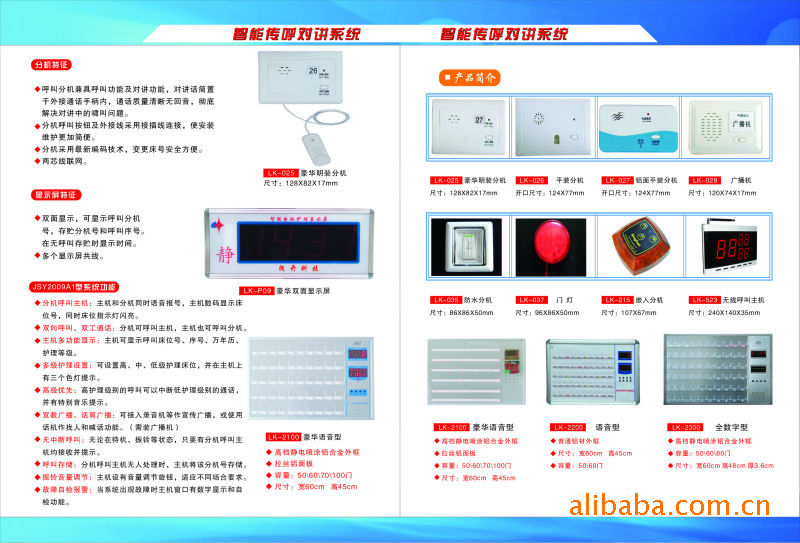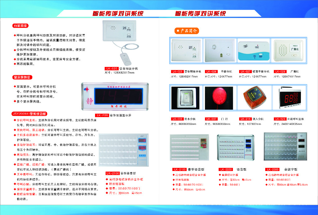 我廠生產(chǎn)的LK系列智能醫(yī)用傳呼系統(tǒng)是我廠傾心研究并全新推出的新一代智能護理通訊產(chǎn)品。它的技術(shù)更***、功能更強大。系統(tǒng)采用兩總線無極性連網(wǎng)方式使安裝與維護更加簡單便捷。主機外殼超薄型設(shè)計,造型精巧,可壁掛、桌面任意放置。多種款式的分機采用流線設(shè)計,新穎美觀,能在各種場合安裝使用,滿足不同客戶的需求。
