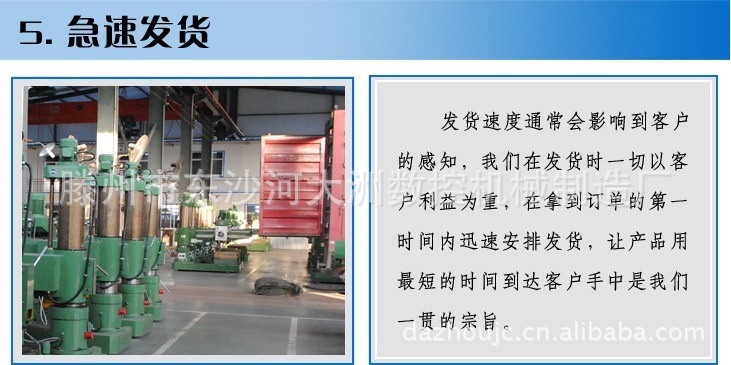 親,客戶訂單后都想時(shí)間收到貨物,我們也深知發(fā)貨速度會(huì)影響客戶感知,我們?cè)诎l(fā)貨時(shí)***為客戶利益為重,在拿到訂單的時(shí)間安排發(fā)貨,由于所有機(jī)床過(guò)高過(guò)大,一般普通物流采用集裝箱沒(méi)法裝運(yùn)(超高,無(wú)法裝車)因此我公司產(chǎn)品采用配貨運(yùn)輸(即集散貨裝整車運(yùn)輸),一般配貨時(shí)間1-2天,但在運(yùn)輸中不轉(zhuǎn)車,程度保證貨物在運(yùn)輸當(dāng)中的安全,貨物裝車后將以快的時(shí)間抵達(dá)卸貨地點(diǎn)。因此請(qǐng)各位顧客耐心等待。