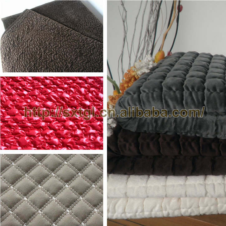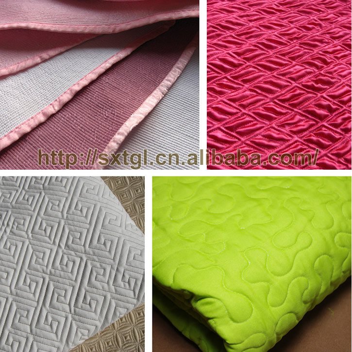 床上用品:可加工各種雙面絨、棉類等面料。門幅可達(dá)3.3米,添加不同厚度的絲棉運(yùn)用不同的花型與起縐起泡等特殊工藝,創(chuàng)造溫馨家居高品質(zhì)生活。