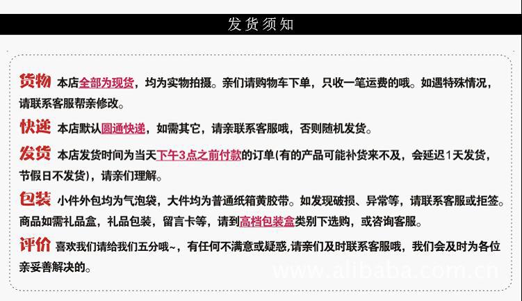 2.所有表明現(xiàn)貨批發(fā)的均表明有現(xiàn)貨,可下單后立即安排配貨及發(fā)貨流程(如遇缺貨,我們會(huì)在時(shí)間通知你換貨或者退款)。購買多件商品請聯(lián)系客服修改運(yùn)費(fèi)后支付。