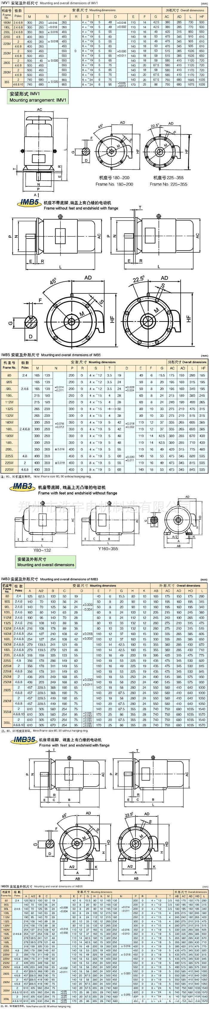 Y系列電機(jī)中心高80-355mm。絕緣等級為B級,外殼防護(hù)等級IP44,冷卻方式IC411?;景惭b方式有IMB3、IMB5、IMB35、V1、V3等。工作方式:S1連續(xù)工作制,環(huán)境溫度-15— +40℃,海拔1000米以下。電壓380V,頻率50HZ。接法:3KW及以下為Y接,4KW及以上為△接。