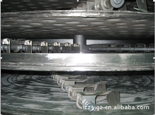 【原 理】 濕物料自加料器連續(xù)地加到干燥器上部層干燥盤上,帶有耙葉的耙臂作回轉(zhuǎn)運(yùn)動,使耙臂連續(xù)地翻抄物料。物料沿指數(shù)螺旋線流過干燥盤表面,在小干燥盤上的物料被移送到外緣,在大干盤上的物料向里移動并從中間落料口落入下一層小干燥盤中。大小干燥盤上下交替排列,物料得以連續(xù)地流過整個干燥器。中空的干燥盤內(nèi)通入加熱介質(zhì),加熱介質(zhì)形式有飽和蒸汽、熱水和導(dǎo)熱油,加熱介質(zhì)由干燥盤的一端進(jìn)入,從另一端導(dǎo)出。已干物料從后一層干燥盤落到殼體的底層,后被耙葉移送到出料口排出。濕汽從物料逸出,由設(shè)在頂蓋上的排濕口排出,真空型盤式干燥器的濕汽由設(shè)在頂蓋上的真空泵口抽出。從底層排出的干物料可直接包裝。通過配加翅片加熱器、溶劑回收冷凝器、袋式除塵器、干料返混機(jī)構(gòu)、引風(fēng)機(jī)等輔機(jī),可提高其干燥的生產(chǎn)能力,干燥膏糊狀和熱敏性物料,可方便地回收溶劑,并能進(jìn)行熱解和反應(yīng)操作。
