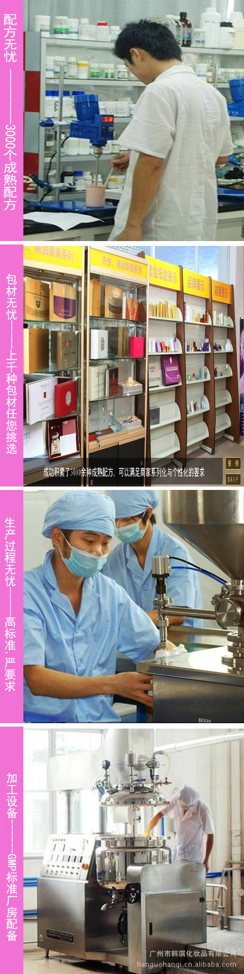 生產(chǎn)硬件:7000平米的生產(chǎn)使用面積、全封閉式10萬(wàn)級(jí)無(wú)菌凈化車間、中央空調(diào)空氣凈化系統(tǒng)、10條自動(dòng)流水作業(yè)線(日產(chǎn)10萬(wàn)PCS,廣州護(hù)膚品OEM行業(yè)產(chǎn)能列,)國(guó)內(nèi)的多容積微電腦自動(dòng)程控真空乳化設(shè)備、兩套全新去離子,反滲透水處理系統(tǒng)。(處理過的水電導(dǎo)率在1.0以下,醫(yī)用水要求4.0以下即可。)