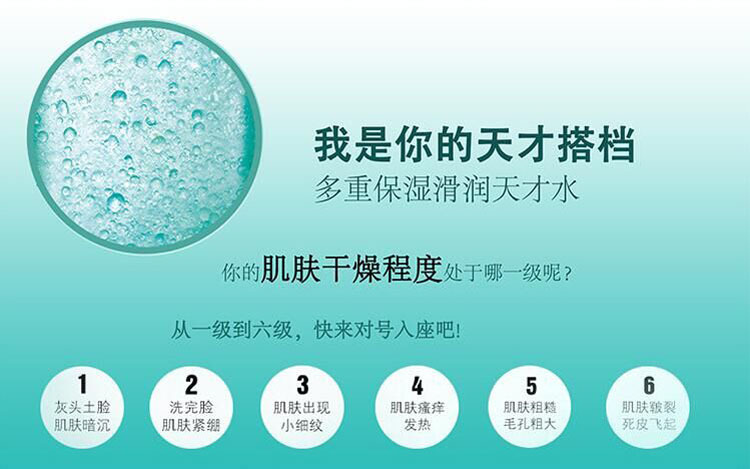 年輕肌膚需要更***的護(hù)膚,層層疊加才能做足的保濕功課,現(xiàn)在,讓這一步放大。將3重保濕功效,凝于天才每一滴:化妝水般的補(bǔ)水力、精華般的滋養(yǎng)力、乳液般的鎖水力,以“水油平衡”的絕妙比例,注入這一瓶清潤(rùn)保濕天才水,***保濕的步,放大后續(xù)護(hù)膚每一步。不同分子大小的營(yíng)養(yǎng)精華及補(bǔ)水成份分別針對(duì)不同肌膚層面發(fā)揮作用,底層補(bǔ)水,里層滋養(yǎng),表層鎖水,帶來(lái)長(zhǎng)效的補(bǔ)水保濕。