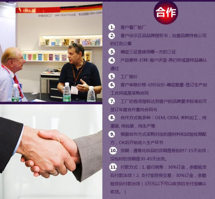 A:簡(jiǎn)單講,OEM就是半成品合作,廠家***是負(fù)責(zé)半成品生產(chǎn)。包材可以客人提供也可以代客戶采購(gòu),或者直接把半成品(即內(nèi)容物)發(fā)送給客人自己灌裝,也可以按客人要求報(bào)價(jià)灌裝費(fèi)代客灌裝。(所有客戶提供的配方、特殊原料、包才、設(shè)計(jì)稿、操作指導(dǎo)等而導(dǎo)致的產(chǎn)品出現(xiàn)不穩(wěn)定現(xiàn)像,廠家只承擔(dān)協(xié)助義務(wù))