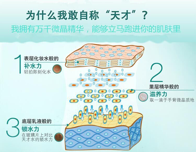 為什么我敢自稱“天才”?我擁有萬(wàn)千微晶精華,咕嚕咕嚕跑進(jìn)你的肌膚。我經(jīng)常會(huì)迸發(fā)出一些天才的“小點(diǎn)子”它們凝聚成了天才微晶粒,每一滴都有著***的保濕效果。