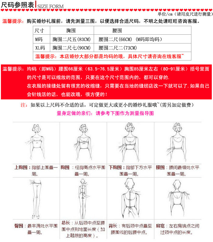 尺碼胸圍胸圍可調(diào)節(jié)范圍腰圍腰圍可調(diào)節(jié)范圍XS2.3-2.5尺改小到74cm,改大到86cm1.8-2.0尺改小到57cm,改大到66cmM2.5-2.7尺改小到80cm,改大到93cm2.0-2.2尺改小到63cm,改大到73cmXL2.7-2.9尺改小到86cm,改大到95cm2.2-2.4尺改小到70cm,改大到79cm 注:由于測量手法不同,可能會有1-3CM的允許范圍內(nèi)誤差 33CM=1尺 每個尺碼的婚紗腋下都有3CM左右的收縮縫,大小稍有不合適的話親們只需要到當?shù)氐牟每p店,拆開收縮縫,放大或者縮小都可以哦,很簡單,只要是裁縫都會改的!標注的價格為衣衣單價,不包括模特佩戴的飾品、手套 、裙撐、頭紗,圖片上模特是有穿裙撐的效果圖,本店有婚紗的配件套餐(頭紗 手套 裙撐) 建議一起搭配購買哦