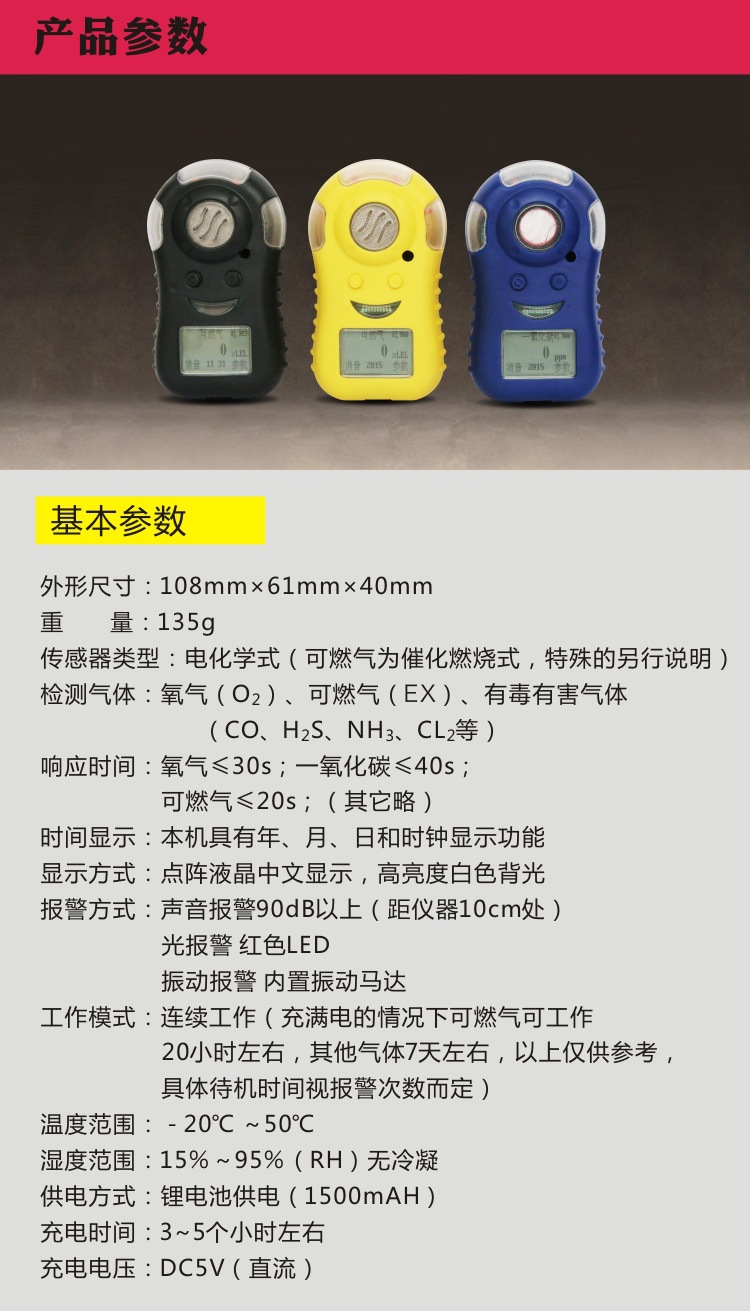 便攜式單一氣體檢測(cè)儀,是一種可連續(xù)檢測(cè)作業(yè)環(huán)境中有毒有害、易燃易爆氣體濃度的儀器。檢測(cè)儀為自然擴(kuò)散方式檢測(cè)氣體濃度,采用進(jìn)口傳感器,具有良好的靈敏度和出色的重復(fù)性;開機(jī)自動(dòng)檢測(cè),具有***的自診斷和自修復(fù)功能;儀器采用嵌入式微控制技術(shù),菜單操作簡(jiǎn)單,功能齊全,可靠性高,具有多種自適應(yīng)能力;使用液晶漢字顯示屏,直觀清晰;故障及欠壓指示,屏幕顯示可旋轉(zhuǎn)180度,可方便不同習(xí)慣者使用,人體工學(xué)設(shè)計(jì),握感舒適、操作簡(jiǎn)單。本儀器可以保存3000條報(bào)警記錄,可按鍵查看或者通過(guò)USB接口將數(shù)據(jù)傳輸至計(jì)算機(jī),配上位機(jī)軟件后可進(jìn)一步分析;可設(shè)置報(bào)警點(diǎn)、標(biāo)定、以及讀取、打印、保存報(bào)警記錄等;1500mAh大容量鋰電池,大大提升設(shè)備續(xù)航時(shí)間;采用USB接口充電,通用充電器充電方便。