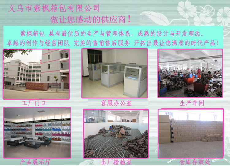 主要從事生產(chǎn)、加工、銷(xiāo)售等業(yè)務(wù),公司擁有一批銷(xiāo)售業(yè)務(wù)精英及技術(shù)***的設(shè)計(jì)人員,開(kāi)發(fā)時(shí)尚箱包、手提包,手袋、化妝包,禮品袋、無(wú)紡布袋,帆布袋,時(shí)裝包,冰包、野餐包 ,零錢(qián)包,筆袋,手機(jī)袋,手機(jī)繩,電腦包,登山包等,產(chǎn)品款式新穎,***,價(jià)格優(yōu)惠,竭誠(chéng)為廣大客戶(hù)提供優(yōu)質(zhì)服務(wù)。經(jīng)過(guò)多年的不懈努力,公司現(xiàn)已建立良好的銷(xiāo)售網(wǎng)絡(luò),產(chǎn)品遠(yuǎn)銷(xiāo)世界各地,深受?chē)?guó)內(nèi)外客戶(hù)的好評(píng)。公司有專(zhuān)門(mén)人員注意收集***市場(chǎng)的各種流行趨勢(shì)和時(shí)尚信息,因此我們每周都會(huì)推出新的款式來(lái)滿(mǎn)足不斷變化的市場(chǎng)需求.我司也竭誠(chéng)歡迎你的來(lái)樣定做和貼牌生產(chǎn).我們的服務(wù)宗旨:以“客戶(hù),質(zhì)量,信譽(yù)至上”為經(jīng)營(yíng)宗旨,公司實(shí)力雄厚、設(shè)備齊全、可開(kāi)17%的增值稅***,歡迎新老客戶(hù)來(lái)人來(lái)電洽談業(yè)務(wù),真誠(chéng)合作,共創(chuàng)輝煌 做讓您感動(dòng)的供應(yīng)商!