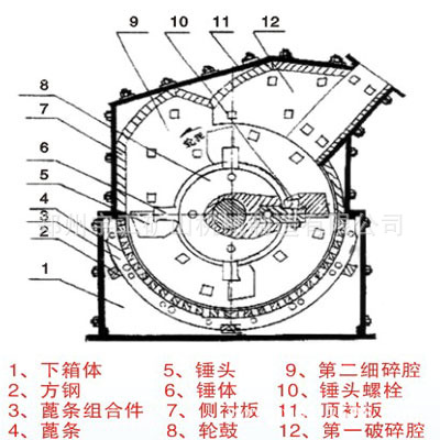 工作時(shí)在電機(jī)的帶動(dòng)下,轉(zhuǎn)子高速旋轉(zhuǎn),物料進(jìn)入破碎腔破碎與轉(zhuǎn)子上的板錘撞擊破碎,然后進(jìn)入第二細(xì)碎腔進(jìn)行粉碎,后從出料口排出。