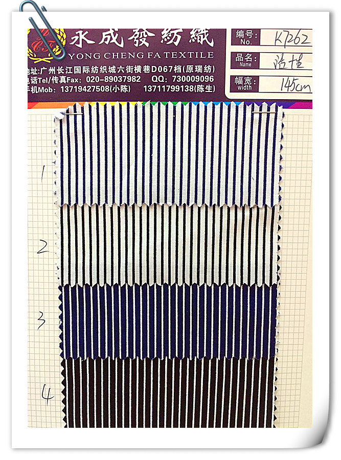 廣州永成發(fā)布行是一家集生產(chǎn)與開(kāi)發(fā),加工與銷(xiāo)售為一體的紡織印染企業(yè),經(jīng)過(guò)多年的發(fā)展,已成為各種休閑服裝布料的主要供應(yīng)商。公司設(shè)備精良,生產(chǎn)工藝***,技術(shù)力量雄厚,貨源充足,品種齊全,質(zhì)量穩(wěn)定,價(jià)格,服務(wù)周到。本公司本著“以質(zhì)量求生存,以信譽(yù)促發(fā)展”的思想,長(zhǎng)期現(xiàn)貨供應(yīng),承接地每批訂單都以***的技術(shù),按客戶要求,及時(shí)交貨,完成客戶對(duì)我們的囑托,達(dá)到客戶滿意至上的原則!謀求共同發(fā)展!本公司主要經(jīng)營(yíng)各種時(shí)尚休閑布料,有府綢布、斜紋布、珠帆、人棉、提花布、時(shí)尚燙金布、潮流印花布、復(fù)合布、水布等(常規(guī)品種長(zhǎng)期現(xiàn)貨供應(yīng),歡迎來(lái)樣訂織、訂染?。?。