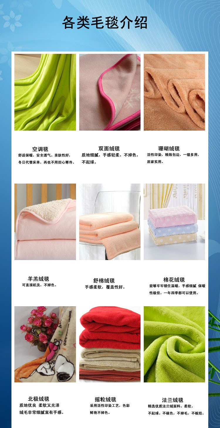 我們公司生產(chǎn)、定做、出口各種毯子,歡迎來電咨詢