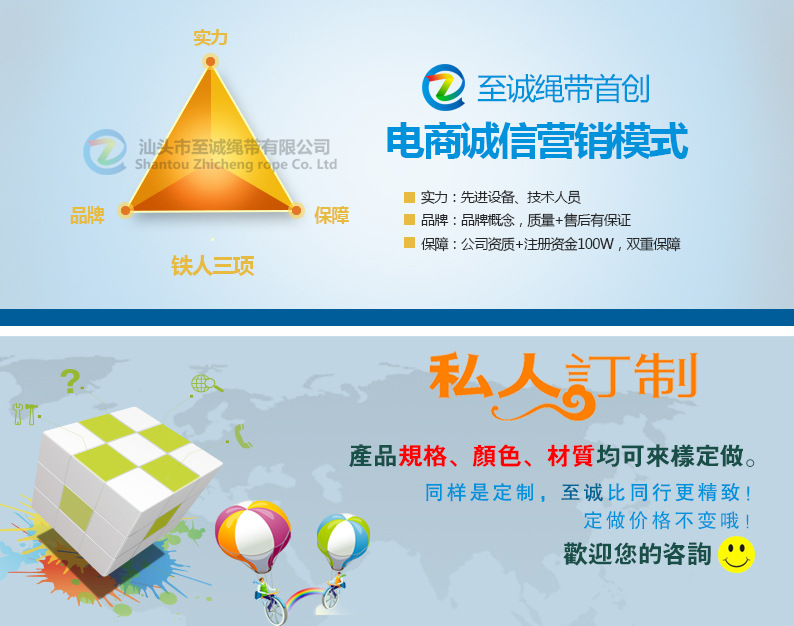 Shantou Zhicheng rope Co., Ltd. has advanced production equipment and processing machinery, one- stop professional production ofbag belt, rope toys, gift belt, garment accessories, PP raw materials, polyester, polypropylene, cotton yarn, lace, twisted rope, rope and other products, we have a complete and scientific quality management system. Line, with a united and efficient team of e- commerce in the operation of the whole electric business platform; line. Our plant is located in Chaoyang District, Shantou City Guan Bu Zhen Xi Ping Industrial Village, convenient transportation, convenient production, Shantou Zhicheng rope Co., Ltd, integrity, strength and product quality for the industry's approval.