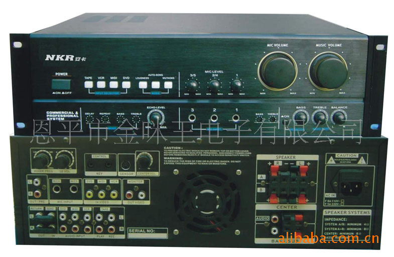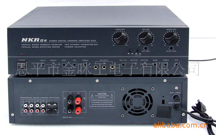 NKR K220參數(shù)規(guī)格: 輸出功率 :150W + 150W(4Ω) 麥克風靈敏度:10mV 輸入靈敏度:200mV 信噪比:>95dB 互調失真(1KHz,200mV):0.1% 頻率響應:20Hz-20KHz 麥克風音調:80Hz±12dB 12KHz±12dB 回響音調:250Hz±12dB 12KHz±12dB 音調:80Hz±12dB 2.5KHz±8dB 2KHz±12dB 體積:420x350x120