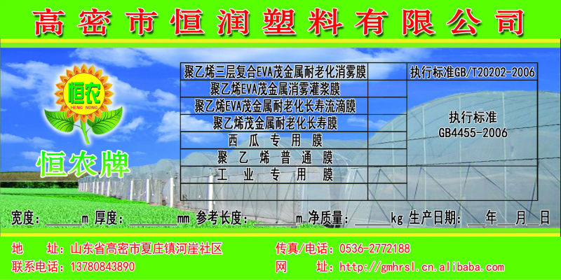 高密市恒潤(rùn)塑料有限公司誕生于中國(guó)***諾貝爾文學(xué)獎(jiǎng)獲得者莫言家鄉(xiāng)—山東.高密。專注于***農(nóng)膜事業(yè),致力于讓農(nóng)民朋友都用上可靠的農(nóng)膜。自公司2006成立至今,我們一直專注于創(chuàng)新。公司科研人員根據(jù)不同的要求,不同的氣候,不同的地區(qū),成功研發(fā)出多項(xiàng)高科技農(nóng)用產(chǎn)品,如:超長(zhǎng)壽消霧膜系列:超長(zhǎng)壽***PO膜、超長(zhǎng)壽***灌漿膜、超長(zhǎng)壽EVA流滴膜等;不同作物專用膜系列:海南、云、貴、川***抗紫外線茂金屬西瓜專用膜、洋香瓜專用膜、金桔專用膜、葡萄專用膜、紫光膜等;地膜系列:1.5米、3.2米寬等不同規(guī)格黑白相間地膜、除草黑地膜、反光銀灰地膜、銀灰黑兩面地膜、綠色完全降解地膜等。為了保證產(chǎn)品質(zhì)量,公司產(chǎn)品核心原材料和助劑全部自國(guó)外進(jìn)口,一系列高科技***技術(shù),***的設(shè)備,***的經(jīng)驗(yàn)使農(nóng)膜產(chǎn)品真正達(dá)到了至精至美的效果,獲得了廣大農(nóng)民朋友的一致好評(píng)。
