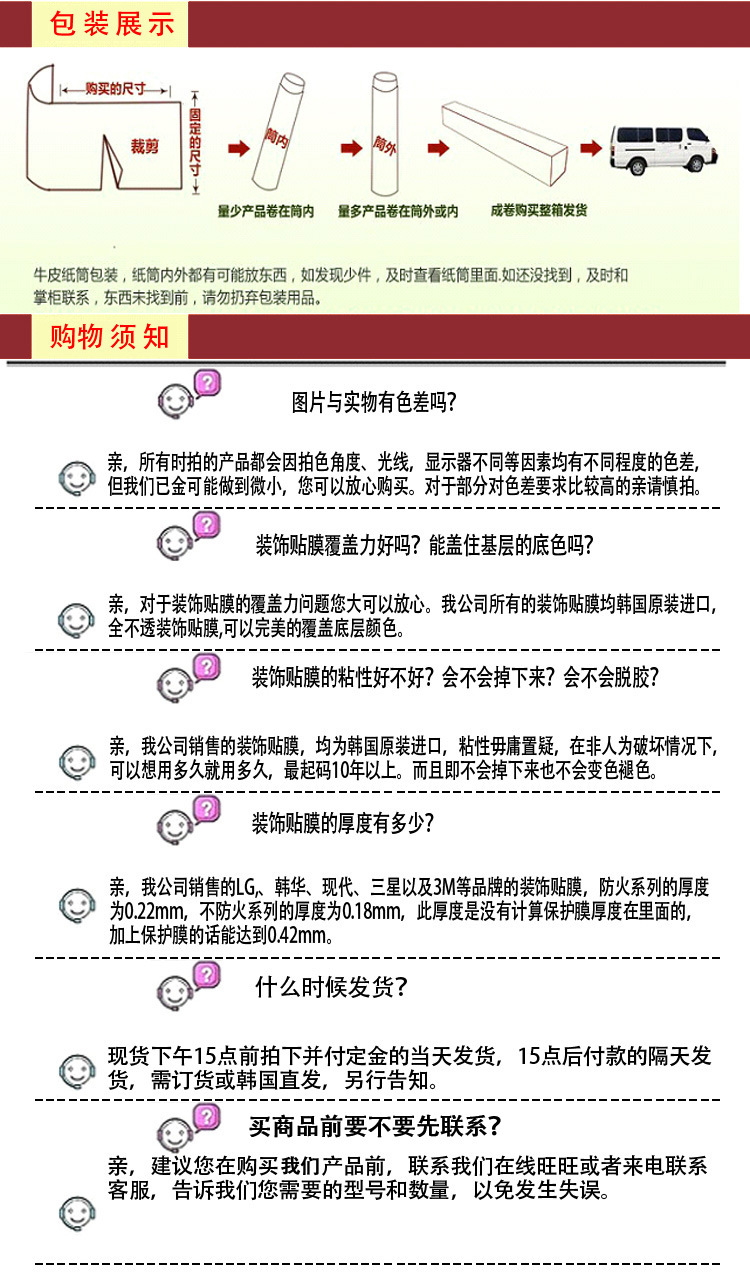 產(chǎn)品說明:裝飾貼膜是進入中國市場的高科技新型裝飾材料。不含有任何有害于人體的成分。利用壓延機設(shè)備及第二次加工設(shè)備而生產(chǎn)的新型環(huán)保產(chǎn)品,利用尖端的印刷技術(shù)及特殊的制作工藝,在特殊加工的膠片上開發(fā)出多種款式的紋理和表面具有凹凸和立體感的很多種類,與原來的收尾材料相比,擁有款式更多的特點,包括自然質(zhì)感的木紋系列,高品質(zhì)感的金屬系列,立體感很強的皮系列,還有顯大氣的大理石系列,是按照消費者要求的氣氛和用途,可以選擇適當(dāng)款式的裝飾施工收尾材料。而且, 經(jīng)特殊剪貼處理,在平面及至曲面上的施工變得簡易,與其它收尾材料相比,既經(jīng)濟又易于施工。他對于碰撞, 摩擦,涂料等的耐久顯著以及防潮, 耐熱,易除污垢等效果顯著,主要用于高級場所的收尾處理,如禮堂、飯店、賣場、百貨商場、賓館、辦公室、機場、公寓、別墅、電梯口、劇院、可貼于鞋柜、書柜、衣柜、書桌、板材、玻璃等等一切表面平滑的基材上 用于衣柜書柜等家具翻新,可瞬間將家具煥然一新。pvc裝飾貼膜在國內(nèi)獲得了消防防火認證,因此不需要做其他防火處理,希望廣大顧客前來光顧。