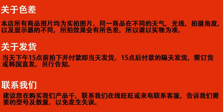 貨期:國(guó)內(nèi)現(xiàn)貨一個(gè)工作日以內(nèi)發(fā)貨,韓國(guó)現(xiàn)貨7-10天到貨(假期有特殊情況)。