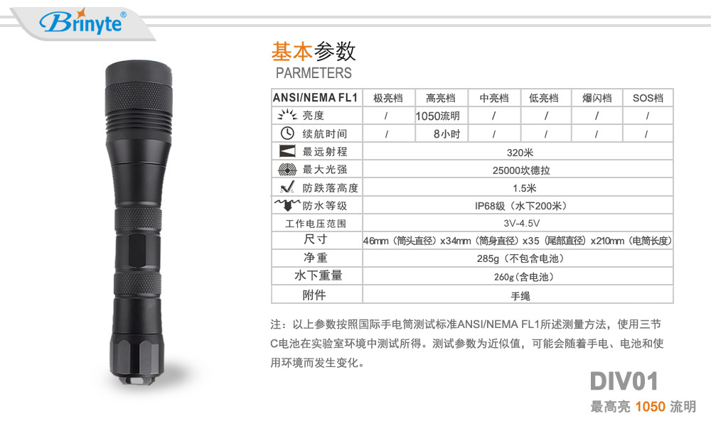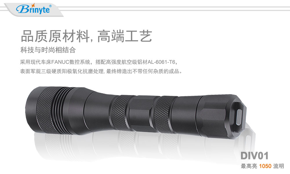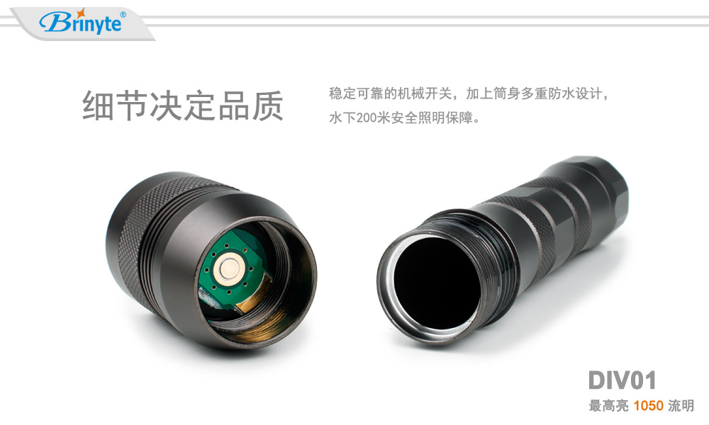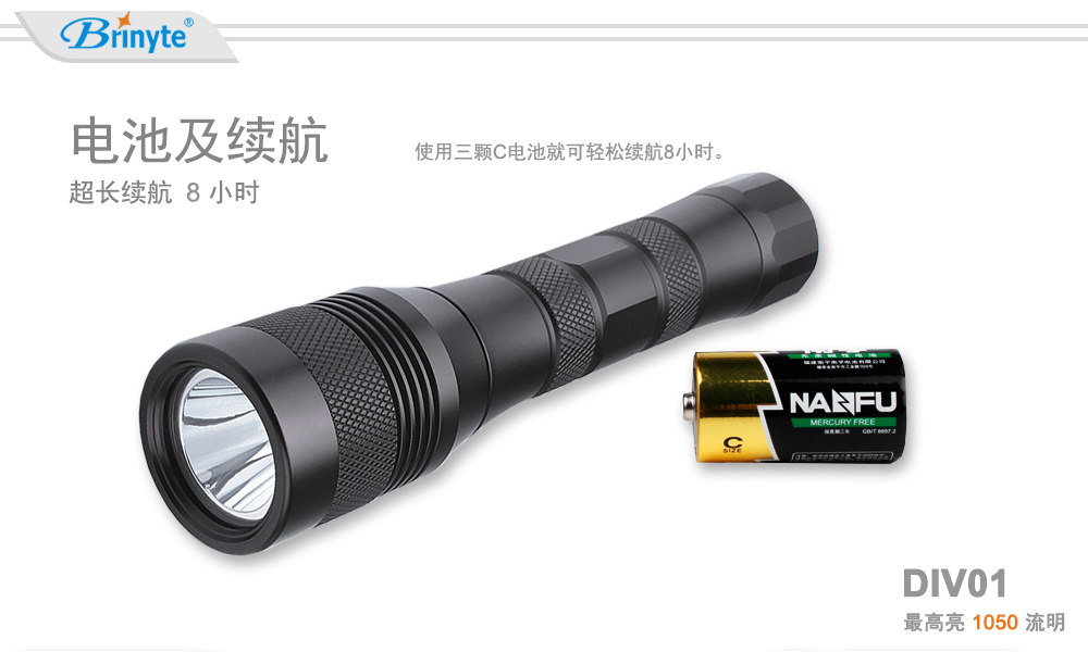 夜光Brinyte DIV01手持式潛水手電筒使用1顆美國(guó)CREE L2(U4)燈珠,1050流明輸出。經(jīng)典的頭部機(jī)械旋轉(zhuǎn)開關(guān)設(shè)計(jì)能有效防止手電筒進(jìn)水。本款手電使用3節(jié)C電池供能,電池易購(gòu)買,免除旅行中的充電煩惱。 夜光Brinyte同時(shí)提供手電檔位、包裝、配件等個(gè)性化定制服務(wù)。