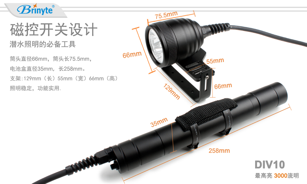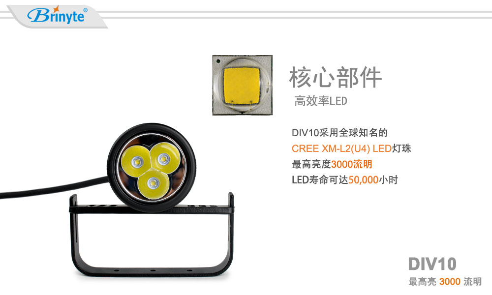 · 本分體式潛水手電筒采用美國最新3顆CREE XM-L2(U4)LED,亮度達(dá)3000流明,磁控開關(guān)設(shè)計不僅操作簡單而且能夠?qū)崿F(xiàn)您對多種輸出模式的要求。使用3節(jié)26650可充電鋰電池,續(xù)航時間達(dá)2.2小時,滿足您的海底照明需求。12°發(fā)光角度加上200米的潛水深度,使本款手電筒是您技術(shù)潛水、水肺潛水主燈的不錯選擇。