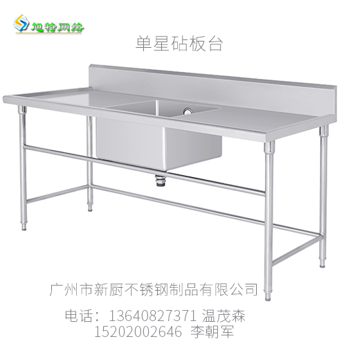 廣州番禺新廚不銹鋼廚房設備制作,生產(chǎn)不銹鋼單星砧板臺,產(chǎn)品采用優(yōu)質(zhì)不銹鋼板加工制作而成,拆裝或固定式均可,可按客戶要求定制。