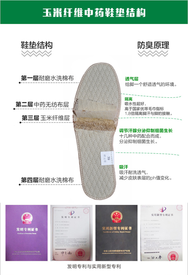 本鞋墊包含 國家專利( “玉米纖維提取”專利號:5383.X),