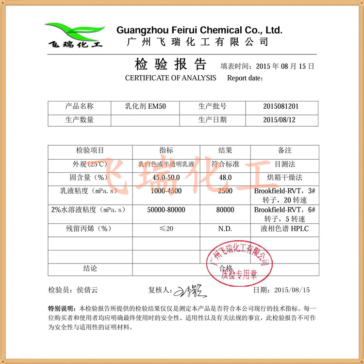 3.熱配工藝:將油相及水相分別加熱至 75-80℃,把油相在攪拌狀態(tài)下加入水相中,均質(zhì)后冷卻至 60℃,加入EM50于正在攪拌的乳化體中,適度均質(zhì)并攪拌 15-20 分鐘。